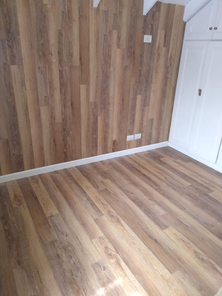 Este piso imita muy bien a la madera con un compuesto derivado del PVC, lo que garantiza su total inmunidad al agua.